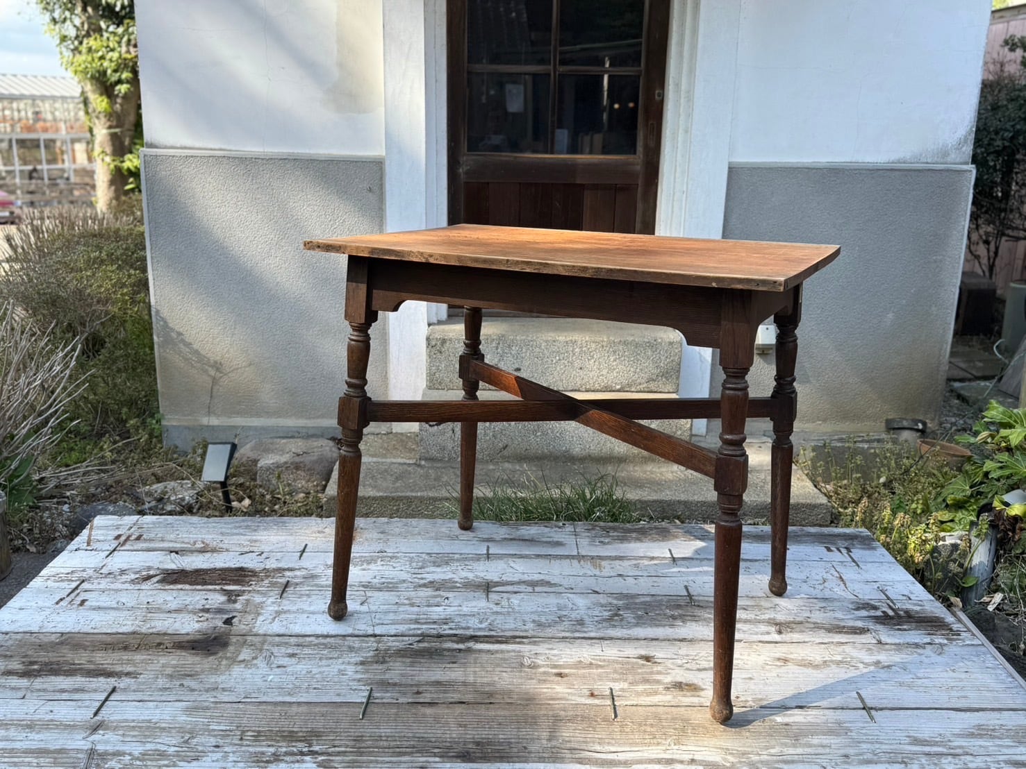 脚部分の装飾と組み木が特徴のイギリスのアンティークテーブル。