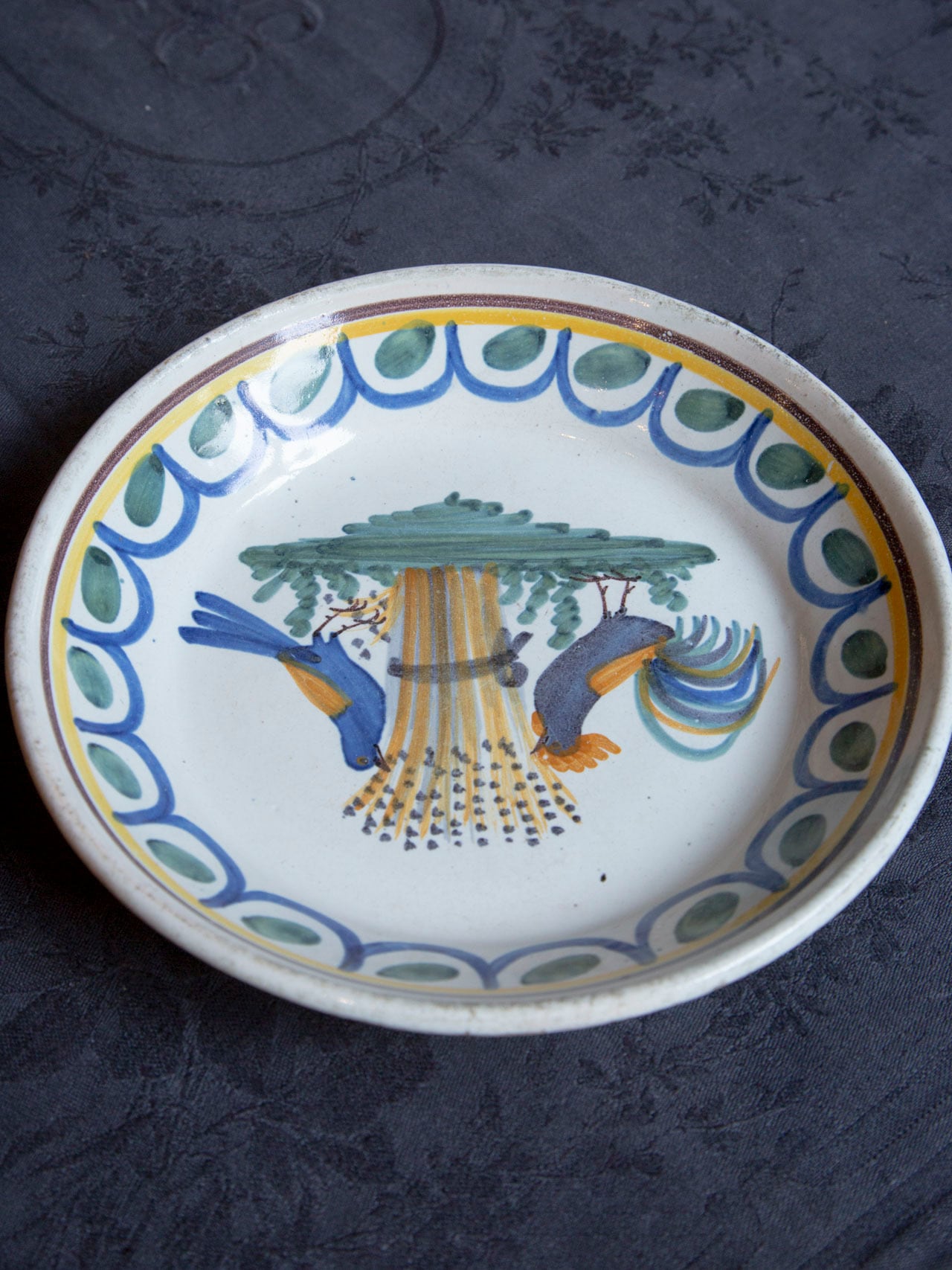 穂束をついばむ鳥が描かれた、素朴で温かみのある一枚です。