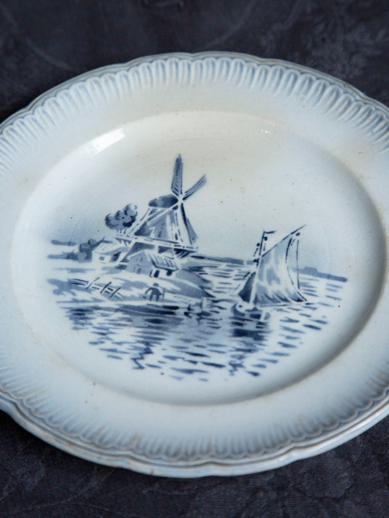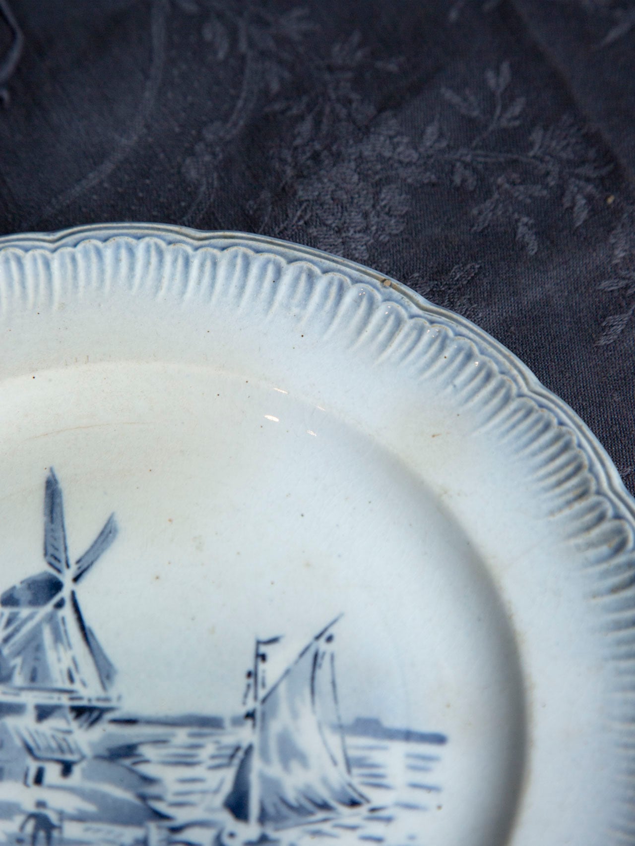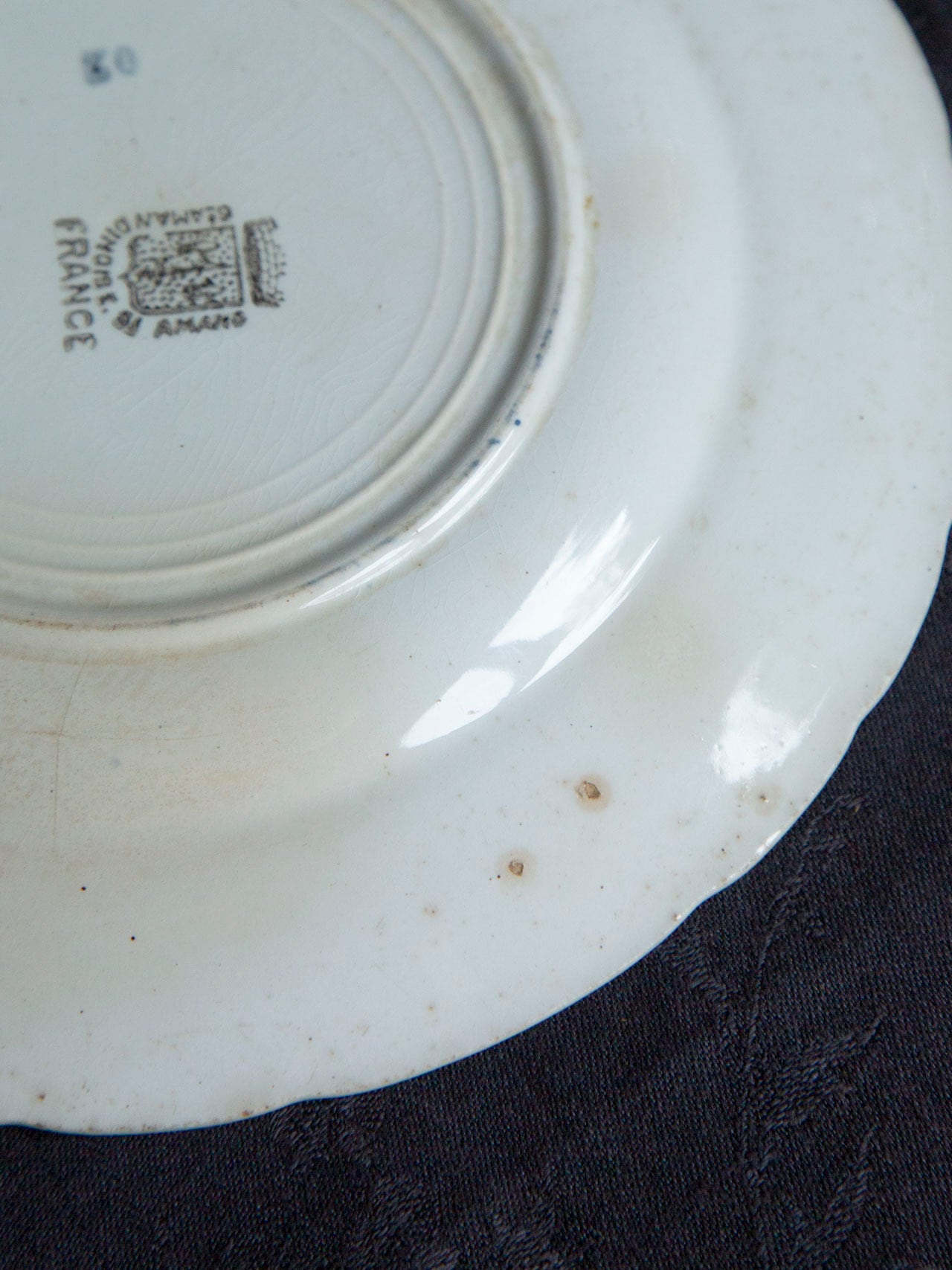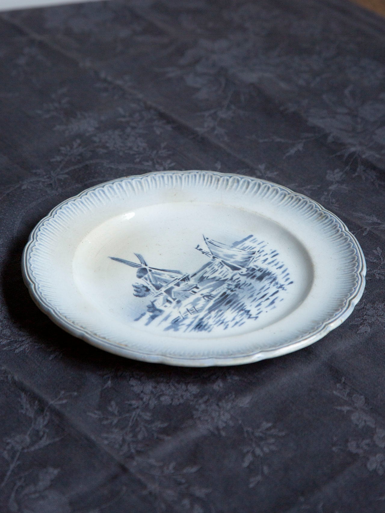 ブルー一色で表現された絵柄は、どこか静けさがあり、フランス北部の陶器らしい素朴な味わいを感じさせます。