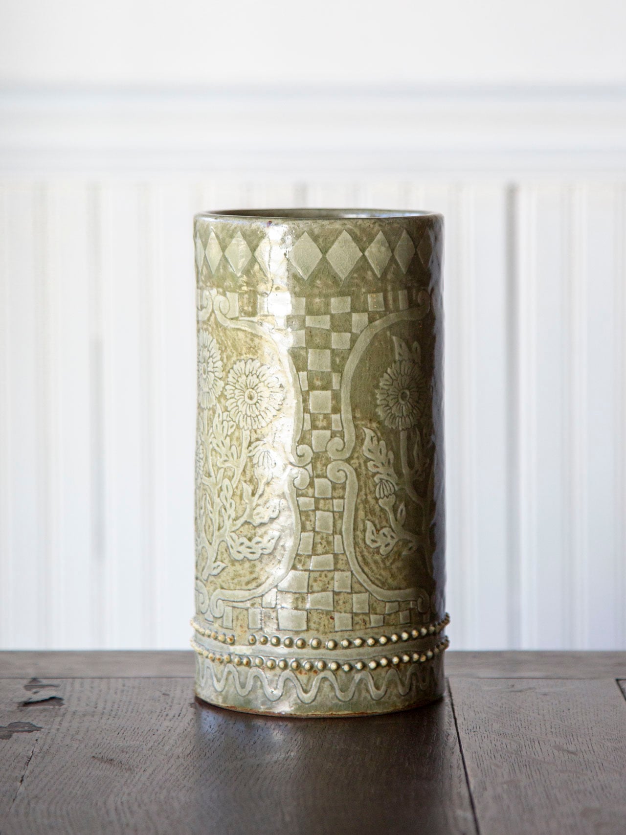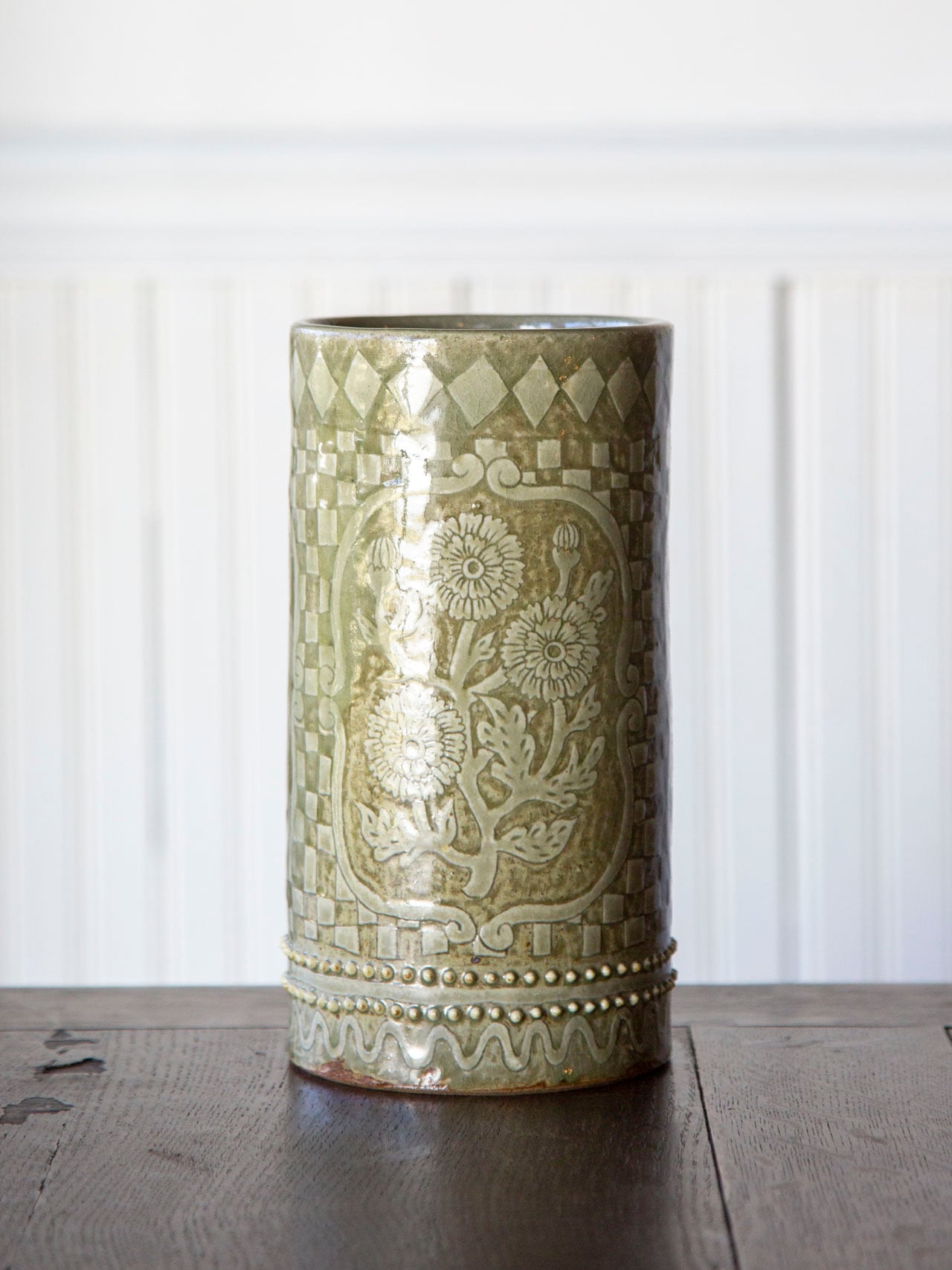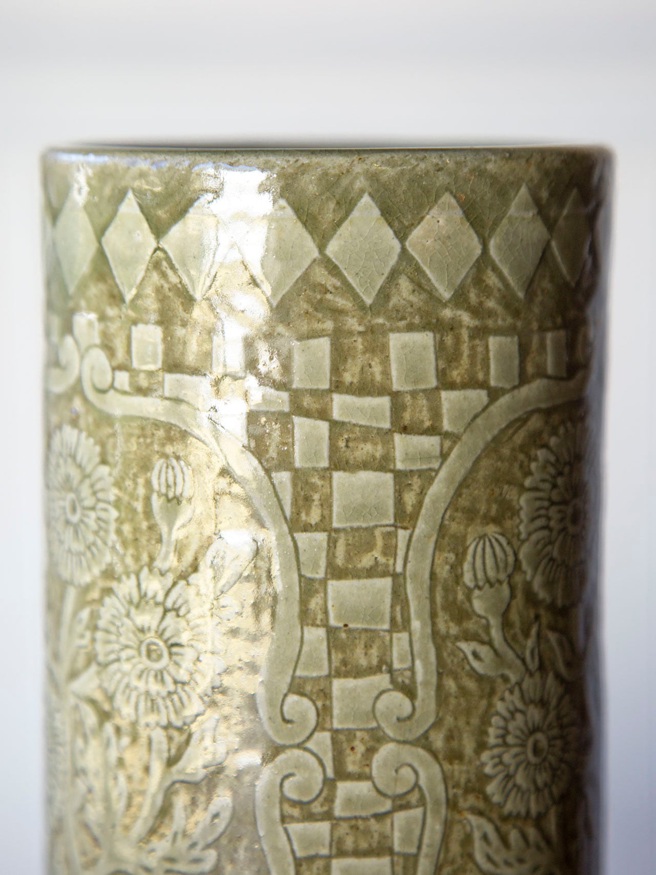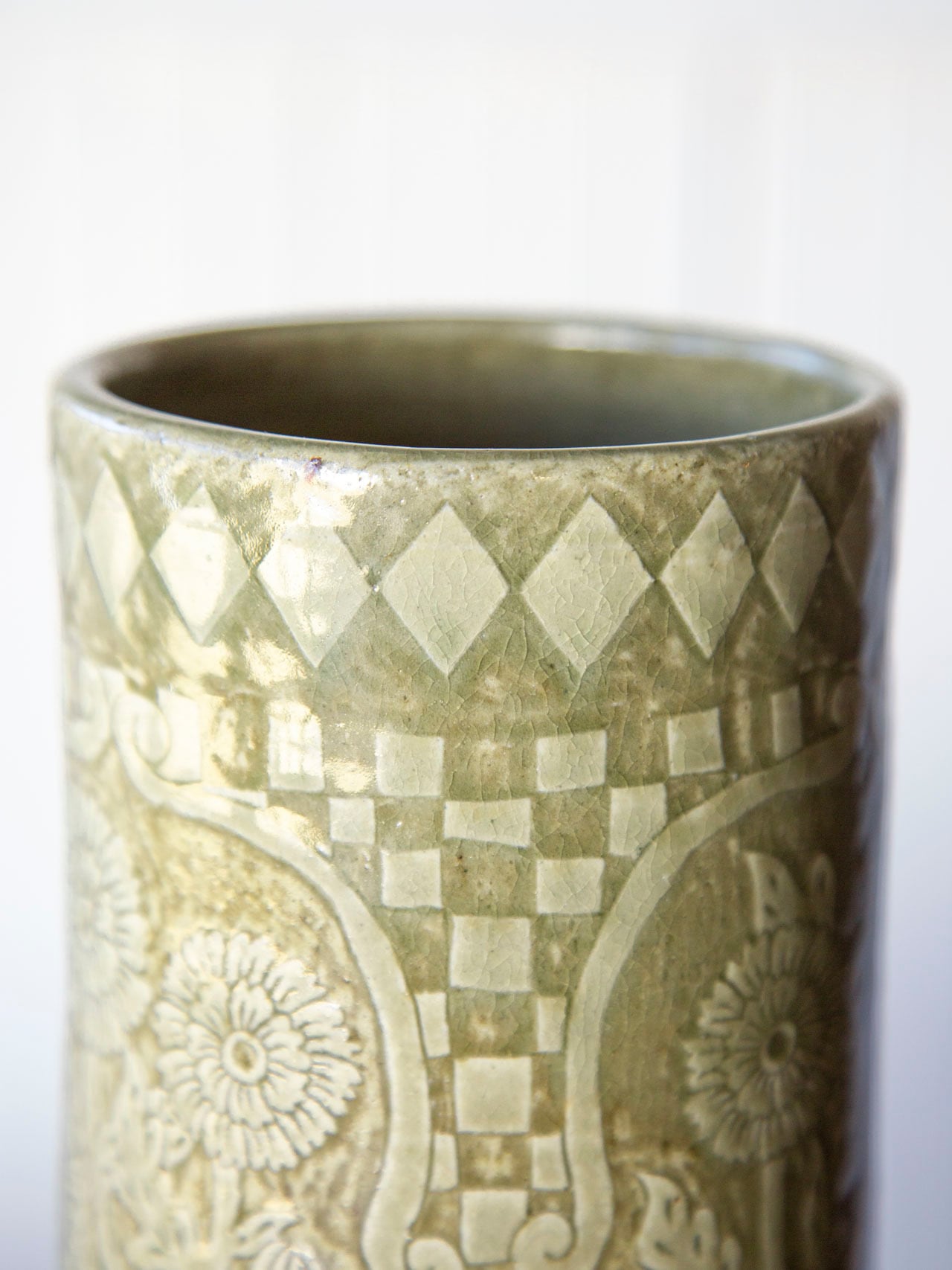 植物紋様の筒型陶器<花瓶>