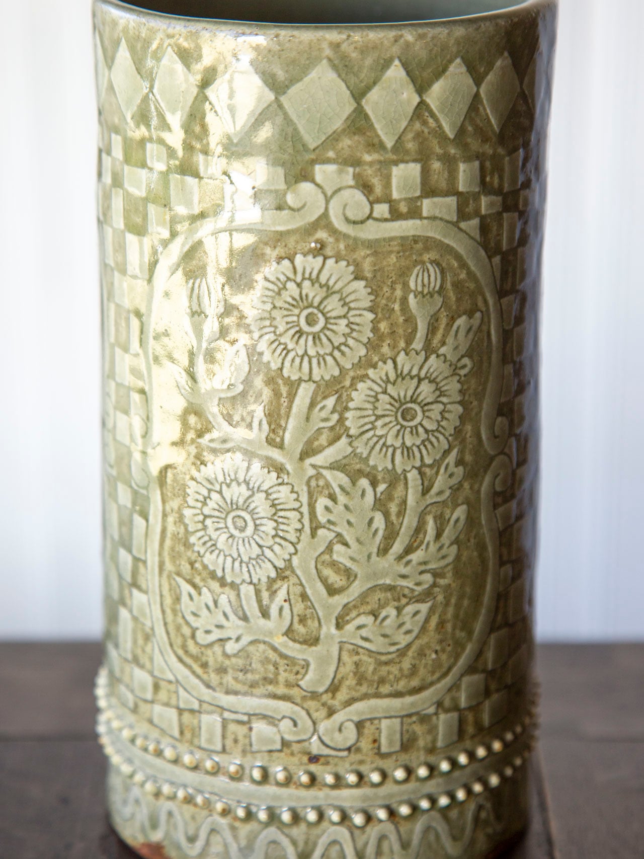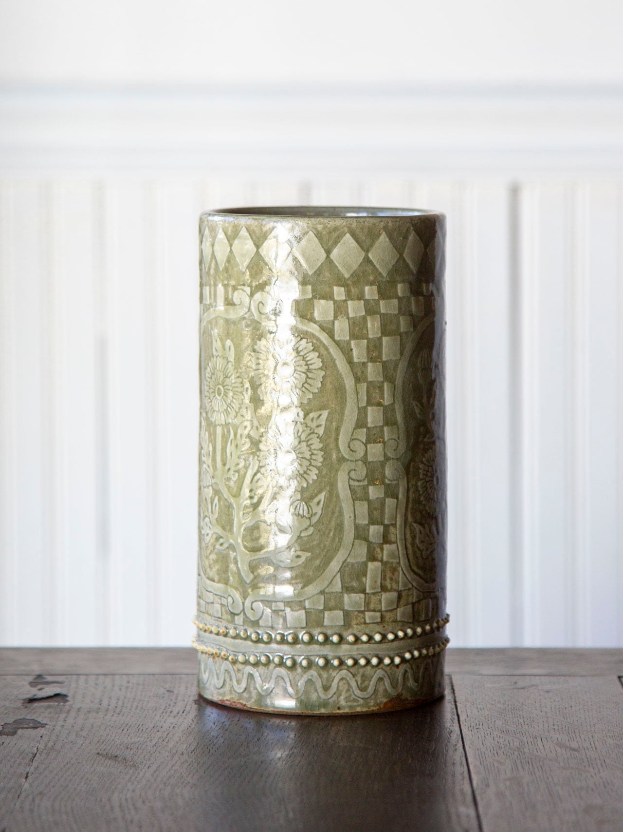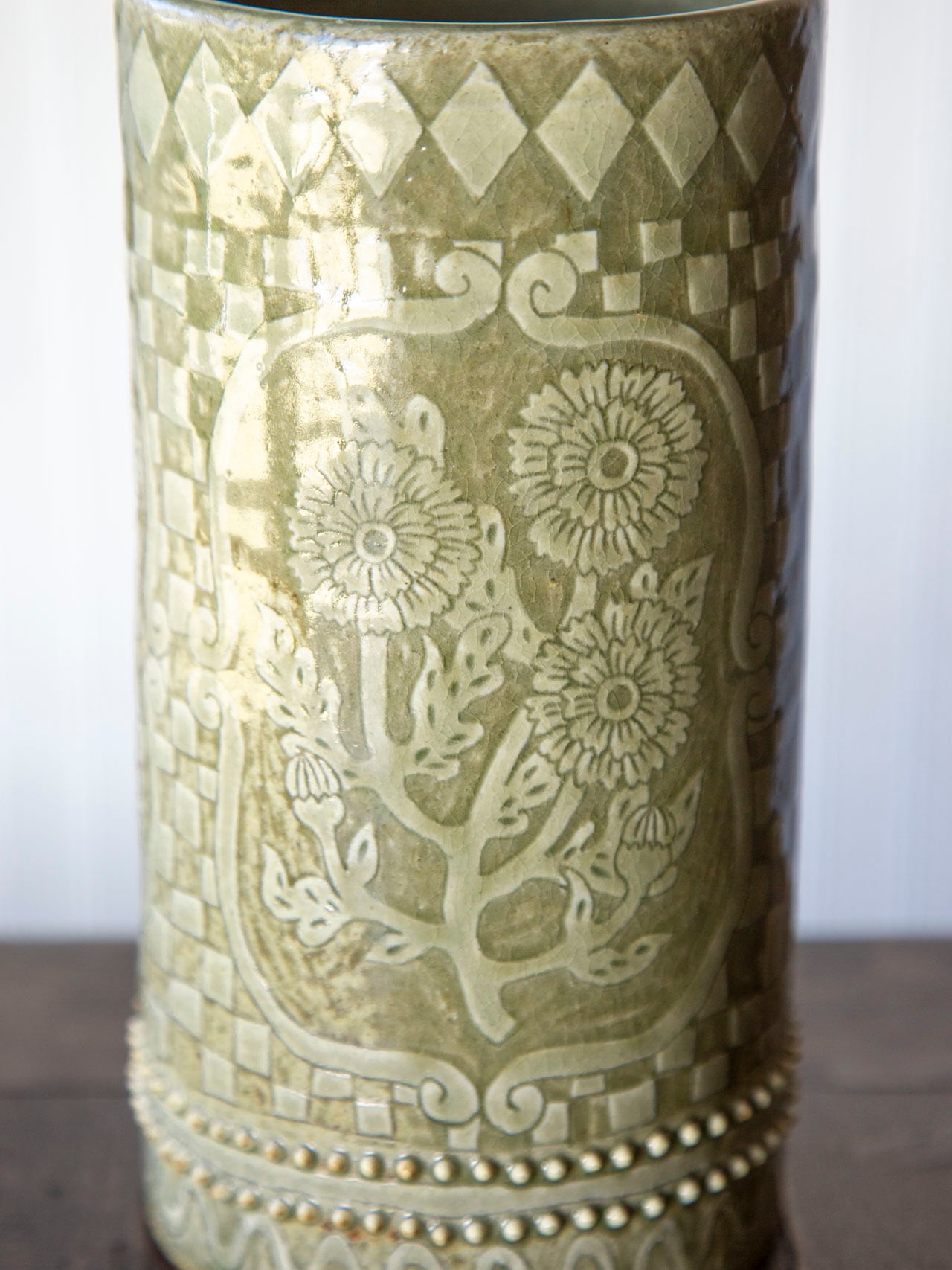 植物紋様の筒型陶器<花瓶>