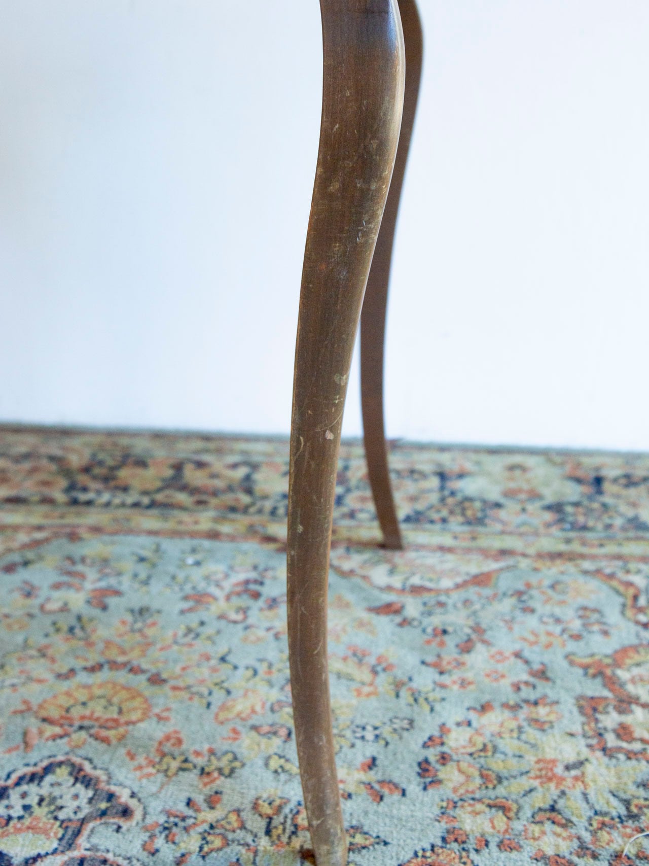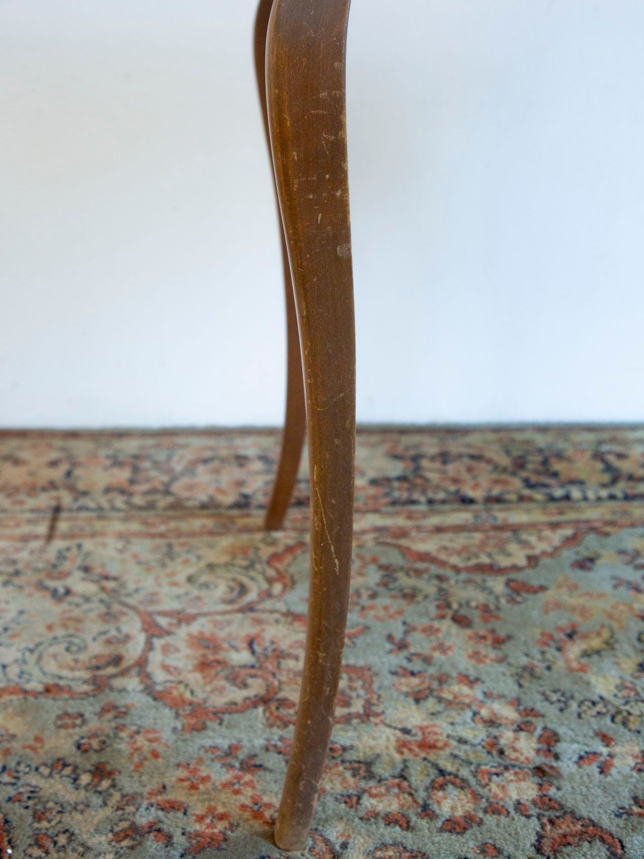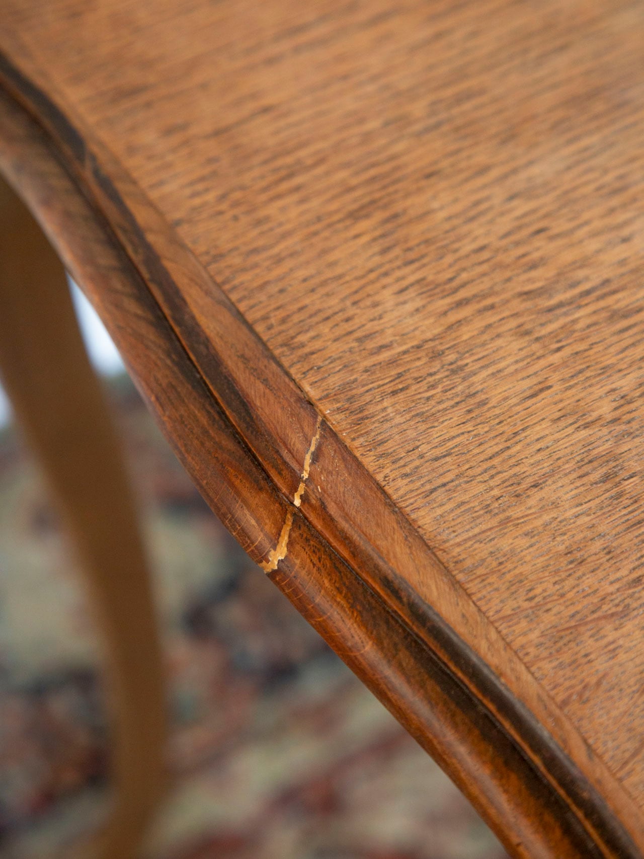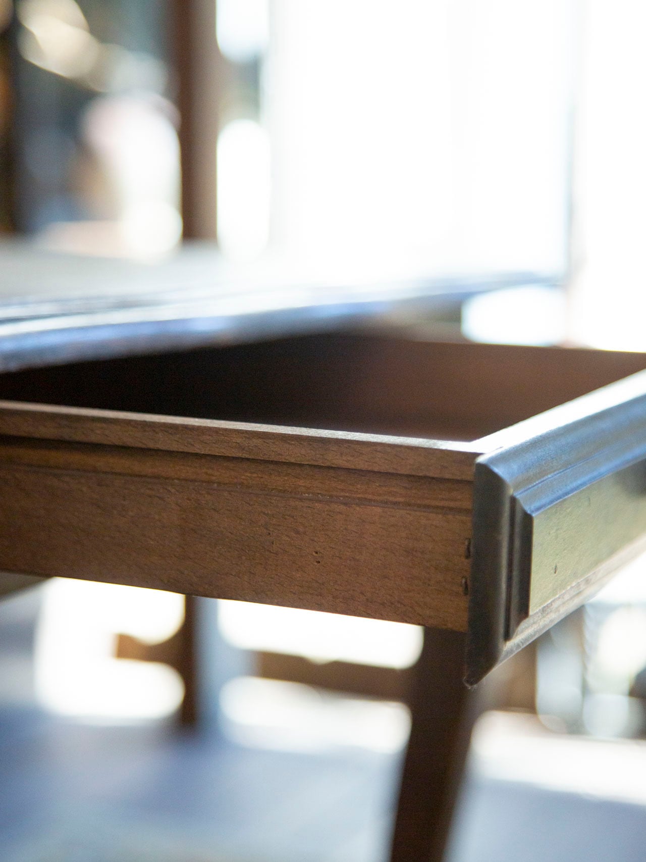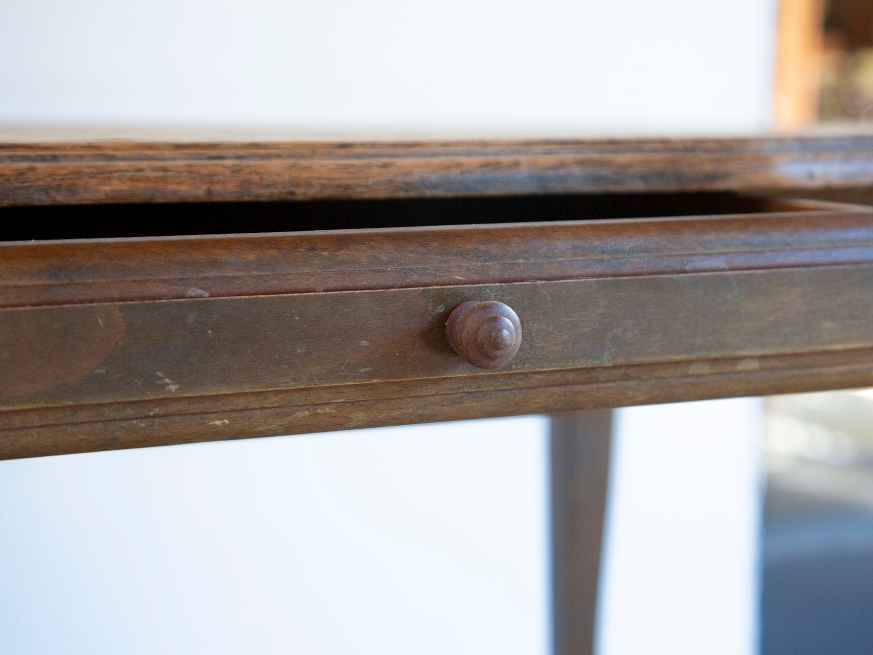 引き出し側の脚にキズが多いこと、天板に傷や蝋燭の跡が残っていることから、