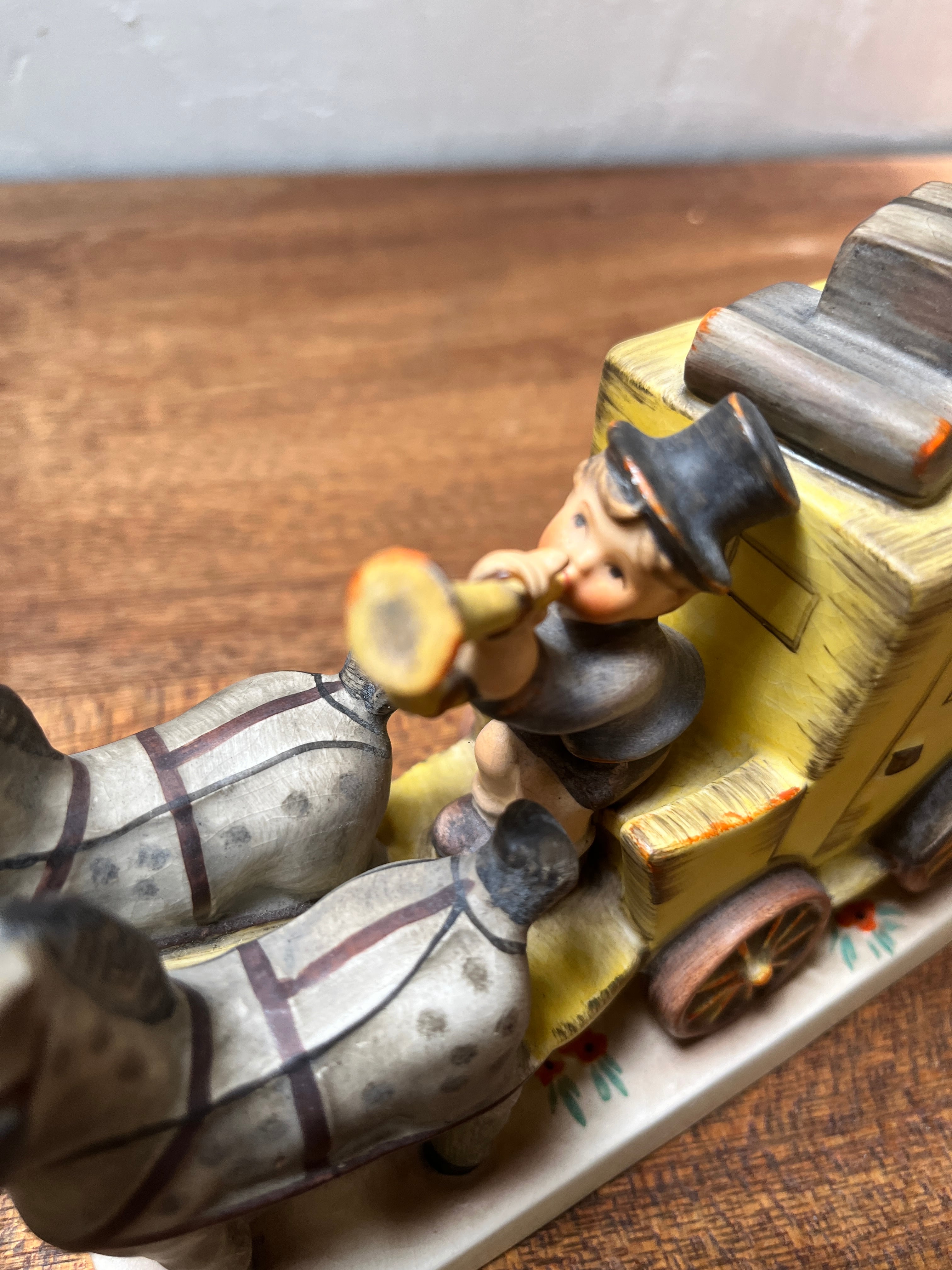 ドイツの修道女マリア イノセンティア フンメルのデザインにより作られた陶磁器人形で、郵便局の馬車に乗り、ラッパを吹きながら手紙を届ける少年がとてもかわいらしいです。