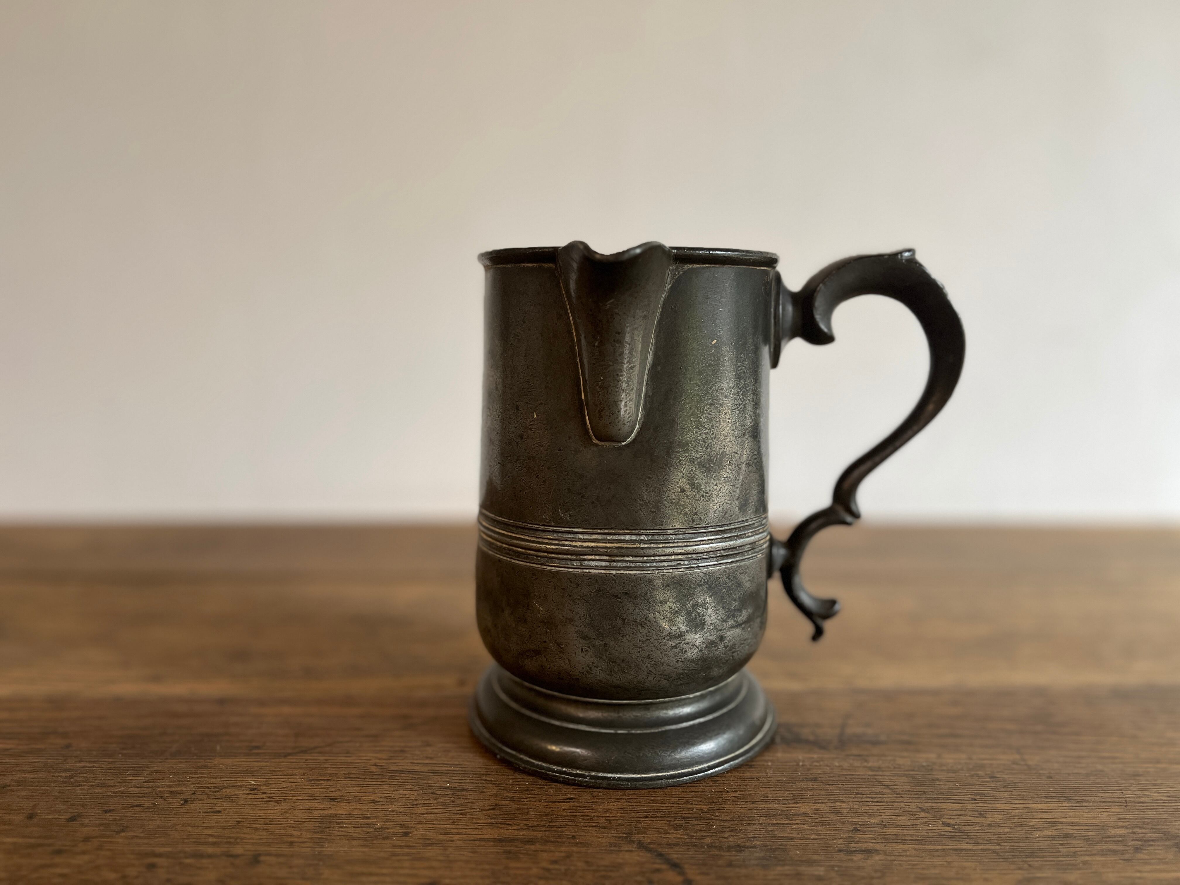 どっしりとしたフォルムと繊細な持ち手、時代を経たピューターの深みを感じる色合いが魅力的なお品です。